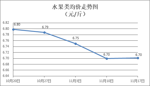水果類商品價格升降互現。所監測的6種水果商品價格波動情況為2漲3跌1平,綜合零售均價為每斤6.70元,環比上漲0.02%。其中橙子、蘋果、葡萄零售均價分別為每斤6.32元、7.43元、13.78元,環比分別下降1.56%、下降0.27%、上漲1.62%。