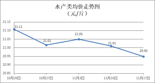 據本市21家農貿市場監測數據顯示,上周(11月11日至11月17日)市場上各類“菜籃子”商品供應充足,所監測的7大類“菜籃子”商品價格總體表現為2漲5跌。其中:糧油類商品價格穩中微跌,肉禽蛋類、水果類商品價格窄幅盤整,蔬菜類、水產類商品價格以降為主。蔬菜與水產類應季商品上市,價格以降為主。隨著氣溫下降,預計部分肉禽類商品需求上升,價格有所回穩。