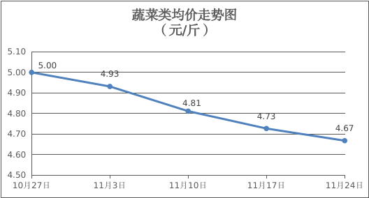 據本市21家農貿市場監測數據顯示,上周(11月18日至11月24日)市場上各類“菜籃子”商品供應充足,所監測的7大類“菜籃子”商品價格總體表現為2漲4跌1平。其中:糧油類商品價格基本平穩,肉禽蛋類、水產類商品價格窄幅盤整,蔬果類商品價格主降。近期氣溫適宜農作物生長及運輸,市場供應增加,蔬果類商品價格普遍回落。現正處于消費淡季,預計各類農產品價格還有下行壓力。