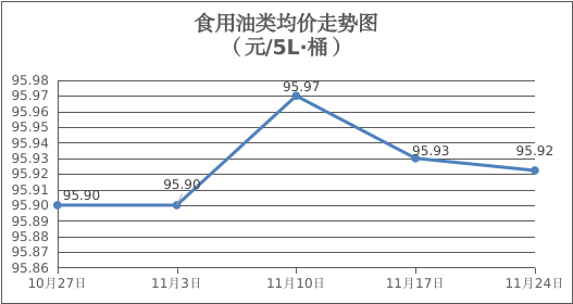 食用油類商品價格穩中微降。所監測的9種食用油(5L裝)商品價格波動情況為2跌7平,綜合零售均價為每桶95.92元,環比下降0.01%。其中:金龍魚花生油、金龍魚調和油零售均價為每桶102.67元、71.21元,環比分別下降0.03%、持平。