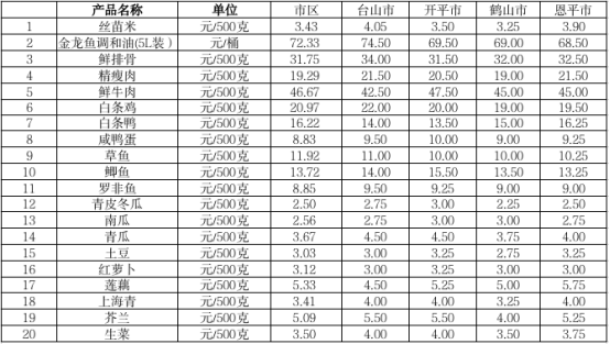說明:1、表中價格為該地區(qū)監(jiān)測點綜合平均價;2、“市區(qū)”含蓬江區(qū)、江海區(qū)、新會區(qū),價格分別采自蓬江市場、江南市場、城東市場等13家農(nóng)貿(mào)市場;3、其他四個縣市價格分別采自新華市場、錦江市場等8家農(nóng)貿(mào)市場。
