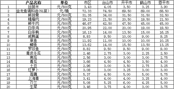說明:1、表中價格為該地區監測點綜合平均價;2、“市區”含蓬江區、江海區、新會區,價格分別采自蓬江市場、江南市場、城東市場等13家農貿市場;3、其他四個縣市價格分別采自新華市場、錦江市場等8家農貿市場。