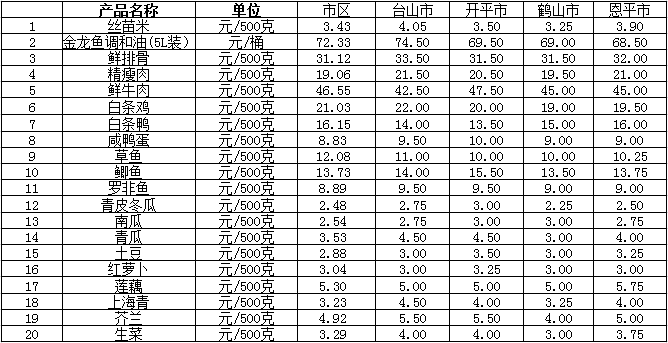 說(shuō)明:1、表中價(jià)格為該地區(qū)監(jiān)測(cè)點(diǎn)綜合平均價(jià);2、“市區(qū)”含蓬江區(qū)、江海區(qū)、新會(huì)區(qū),價(jià)格分別采自蓬江市場(chǎng)、江南市場(chǎng)、城東市場(chǎng)等13家農(nóng)貿(mào)市場(chǎng);3、其他四個(gè)縣市價(jià)格分別采自新華市場(chǎng)、錦江市場(chǎng)等8家農(nóng)貿(mào)市場(chǎng)。