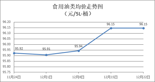 食用油類商品價格穩中微降。所監測的9種食用油(5L裝)商品價格波動情況為1漲4跌4平,綜合零售均價為每桶96.15元,環比下降0.01%。其中:金龍魚花生油、大豆油零售均價為每桶103.20元、62.53元,環比分別下降0.09%、下降0.08%。