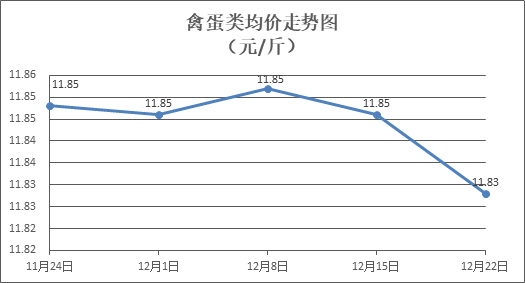 禽蛋類商品價格微幅下降。所監測的5種禽蛋類商品價格波動情況為1漲3跌1平,綜合零售均價為每斤11.83元,環比下降0.15%。其中:白條雞、白條鴨零售均價分別為每斤20.56元、15.22元,環比分別上漲0.15%、下降0.52%;雞蛋、鴨蛋零售均價分別為每斤6.55元、7.67元,環比分別持平、下降0.26%。