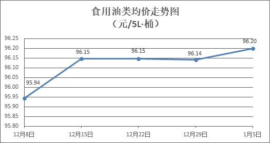 食用油類商品價格穩中略漲。所監測的9種食用油(5L裝)商品價格波動情況為4漲5平,綜合零售均價為每桶96.20元,環比上漲0.06%。其中:金龍魚花生油、金龍魚調和油零售均價為每桶103.14元、71.68元,環比分別持平、上漲0.15%。