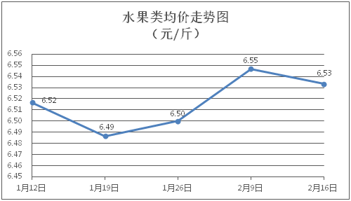 水果類商品價格微幅下降。所監測的6種水果商品價格波動情況為1漲4跌1平,綜合零售均價為每斤6.53元,環比下降0.20%。其中橙子、香蕉、葡萄零售均價分別為每斤5.90元、3.18元、13.58元,環比分別上漲0.85%、下降1.24%、下降0.37%。