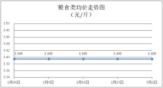 糧食類商品價格保持穩定。所監測的4種糧食類商品價格均持平,綜合零售均價為每斤3.395元。其中:絲苗米、面粉零售均價分別為每斤3.54元、3.40元,環比均持平。