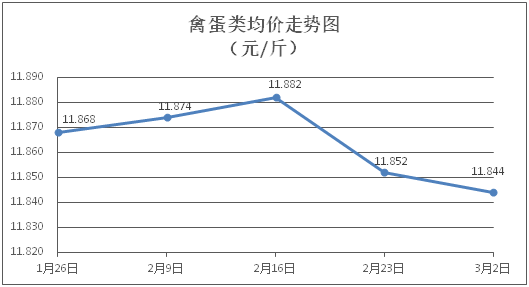 禽蛋類商品價格略有下降。所監測的5種禽蛋類商品價格波動情況為1漲3跌1平,綜合零售均價為每斤11.844元,環比下降0.07%。其中:白條雞、白條鴨零售均價分別為每斤20.56元、15.26元,環比分別下降0.10%、下降0.13%;雞蛋、鴨蛋零售均價分別為每斤6.59元、7.67元,環比分別下降0.30%、上漲0.26%。
