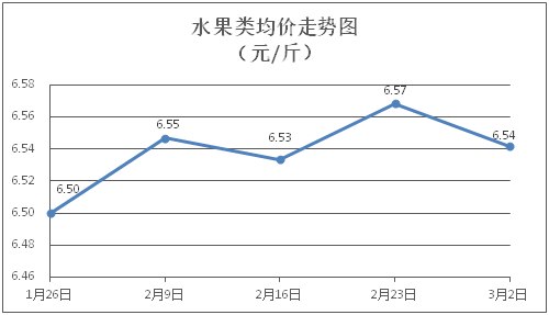 水果類商品價格小幅波動。所監測的6種水果商品價格波動情況為3漲1跌2平,綜合零售均價為每斤6.54元,環比下降0.41%。其中蘋果、葡萄、西瓜零售均價分別為每斤7.49元、13.73元、3.47元,環比分別上漲0.13%、上漲0.37%、下降6.47%。
