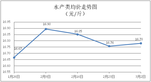 水產類商品價格弱勢盤整。所監測的9種水產商品價格波動情況為2漲4跌3平,綜合均價為每斤16.78元,環比上漲0.14%。其中:草魚、鯽魚、鳙魚、羅非魚、基圍蝦零售均價分別為每斤11.07元、14.30元、10.82元、9.13元、30.07元,環比分別下降0.18%、下降0.14%、上漲0.28%、下降0.65%、下降0.07%。