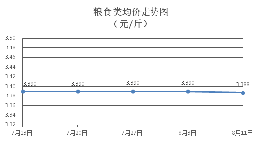 糧食類商品價格基本平穩。所監測的4種糧食類商品價格波動情況為1跌3平,綜合零售均價為每斤3.388元,環比下降0.07%。其中:珍珠米、面粉零售均價分別為每斤3.10元、3.39元,環比分別持平、下降0.29%。