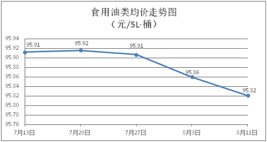 食用油類商品價格穩中微降。所監測的9種食用油(5L裝)商品價格波動情況為1漲4跌4平,綜合零售均價為每桶95.82元,環比下降0.04%。其中:金龍魚花生油、金龍魚調和油零售均價為每桶102.62元、70.82元,環比分別下降0.20%、下降0.10%。