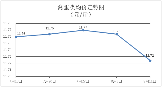 禽蛋類商品價格總體略降。所監測的5種禽蛋類商品價格波動情況為2漲2跌1平,綜合零售均價為每斤11.72元,環比下降0.34%。其中:白條雞、白條鴨零售均價分別為每斤20.77元、15.21元,環比分別上漲0.53%、下降1.36%;雞蛋、鴨蛋零售均價分別為每斤6.42元、7.08元,環比分別下降1.68%、上漲0.14%。