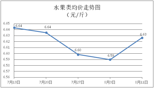 水果類商品價格漲跌互現。所監測的6種水果商品價格波動情況為3漲3跌,綜合零售均價為每斤6.63元,環比上漲0.56%。其中橙子、香蕉、葡萄零售均價分別為每斤6.86元、3.29元、13.59元,環比分別上漲2.69%、下降1.50%、下降0.07%。