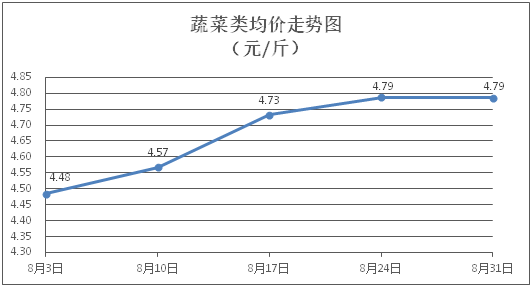 蔬菜類商品價格漲跌互現。所監測的32 種蔬菜商品價格波動情況為14漲15跌3平,綜合零售均價為每斤4.79元,環比下降0.03%。其中:漲幅居前的品種包括椰菜、黃瓜、蒜苔,零售均價分別為每斤3.14元、4.19元、8.14元,環比分別上漲6.08%、6.08%、1.88%;跌幅靠前的品種包括白莧菜、本地菜心、水東芥菜,零售均價分別為每斤4.44元、5.60元、4.61元,環比分別下降6.53%、4.76%、1.28%。