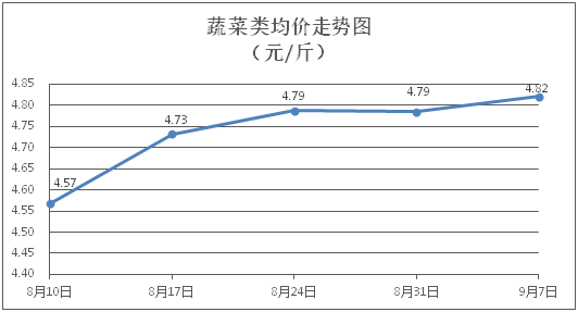 蔬菜類商品價格總體略漲。所監測的32 種蔬菜商品價格波動情況為17漲11跌4平,綜合零售均價為每斤4.82元,環比上漲0.74%。其中:漲幅居前的品種包括黃瓜、芥蘭、西芹,零售均價分別為每斤4.53元、5.80元、5.05元,環比分別上漲8.11%、2.65%、2.64%;跌幅靠前的品種包括苦瓜、水東芥菜、菠菜,零售均價分別為每斤5.13元、4.57元、7.17元,環比分別下降0.97%、0.87%、0.69%。