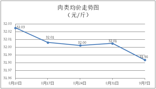 肉類商品價格微幅下降。所監測的8種肉類商品價格波動情況為1漲6跌1平,綜合零售均價為每斤31.98元,環比下降0.07%。其中:排骨、精瘦肉、牛肉、帶骨羊肉零售均價分別為每斤30.23元、18.87元、46.29元、42.01元,環比分別下降0.30%、下降0.16%、持平、下降0.10%。