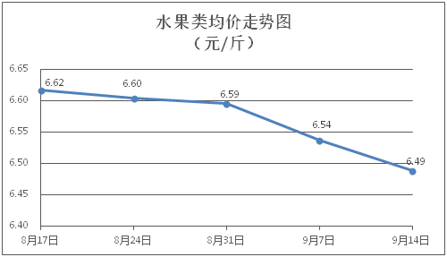 水果類商品價格小幅下降。所監測的6種水果商品價格波動情況為4跌2平,綜合零售均價為每斤6.49元,環比下降0.74%。其中橙子、香蕉、葡萄零售均價分別為每斤7.15元、3.05元、12.69元,環比分別下降0.42%、下降0.33%、下降1.40%。