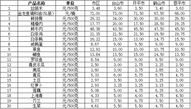 說明:1、表中價格為該地區監測點綜合平均價;2、“市區”含蓬江區、江海區、新會區,價格分別采自蓬江市場、江南市場、城東市場等13家農貿市場;3、其他四個縣市價格分別采自新華市場、錦江市場等8家農貿市場。