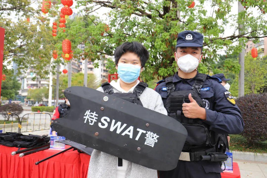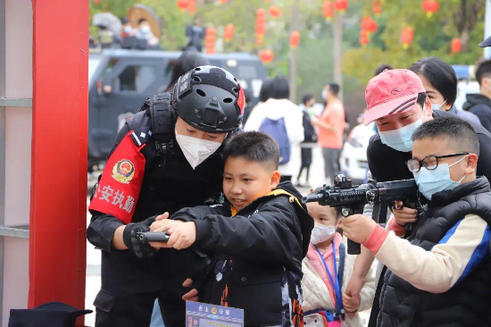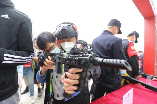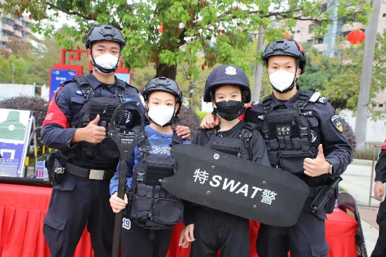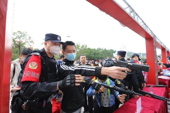 參觀群眾手持警用槍支(安全狀態),在特警隊員指導下瞄準。孩子們戴上特警頭盔、穿上防刺背心,登上裝甲車,秒變“小特警”。