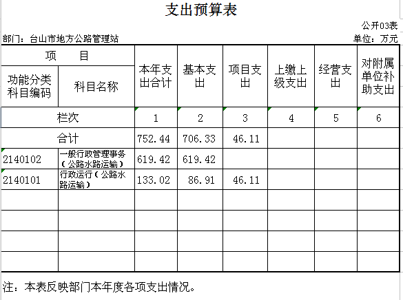 2016年支出預算752.44萬元,其中資金來源是:一般公共財政預算撥款752.44萬元,比上年增加185.35萬元,增長32.68%。主要原因一是2015年預算項目支出(交通“六費”替代性收入返還款)和臨工工資由市交通運輸局編制,2016年項目支出分別是133.02萬元和245.73萬元由市公路管理站編制。二是因政策性調資,增加工資福利支出23.08萬元;三是商品和服務支出(公用經費)減少15萬元。