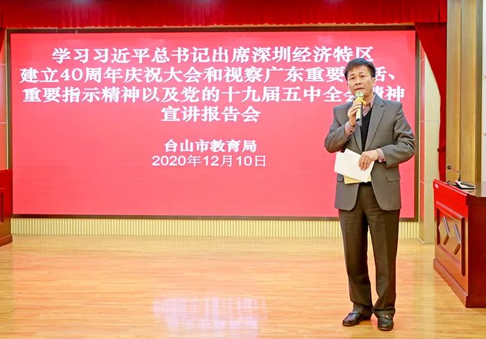 12月10日,市教育局召開全市教育系統學習習近平總書記出席深圳經濟特區建立40周年慶祝大會和視察廣東重要講話、重要指示精神以及黨的十九屆五中全會精神專題宣講會,局機關全體干部、直屬單位主要負責人參加。會議由教育局黨組書記、局長李石湊主持。