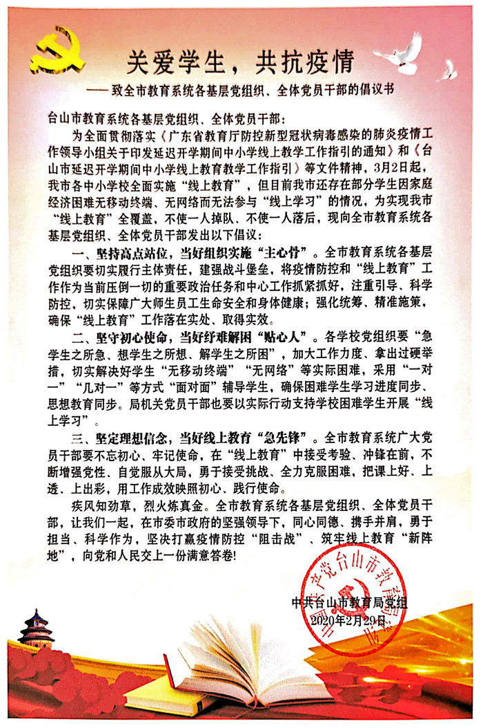 隨后,市教育局黨組印發(fā)《倡議書》,號(hào)召全市教育系統(tǒng)各基層黨組織、全體黨員干部踐行初心使命,當(dāng)好學(xué)生“貼心人”,為特殊群體學(xué)生紓難解困,解決好學(xué)生“無(wú)終端”“無(wú)網(wǎng)絡(luò)”等實(shí)際困難。同時(shí),主動(dòng)聯(lián)系中國(guó)電信、中國(guó)移動(dòng)、中國(guó)聯(lián)通和臺(tái)山電視臺(tái)等單位,協(xié)商制定優(yōu)惠政策,幫助學(xué)生家庭減輕經(jīng)濟(jì)負(fù)擔(dān),落實(shí)解決網(wǎng)絡(luò)和終端問(wèn)題,不讓任何一個(gè)學(xué)生掉隊(duì)。