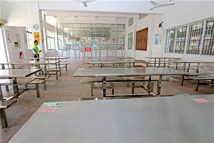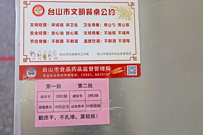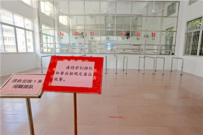 師生員工實施錯峰放學,食堂正門口排隊測溫。兩人間隔1米排隊領餐、即取即走。為避免扎堆就餐,學校在指定的餐位桌面上貼有學生姓名和座位號,實行分散、單向就餐,就餐結束后立即佩戴口罩迅速離開。