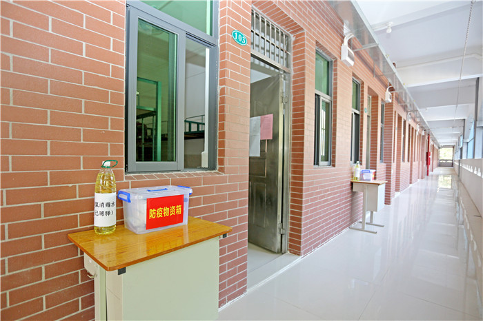 每個宿舍門前配有防疫物資箱,讓學生進入宿舍時做好手部清潔,指導學生做好宿舍通風工作,同時安排專人負責宿舍的酒精消毒及通風。此外,要求學生掛上蚊帳并同一方向休息。