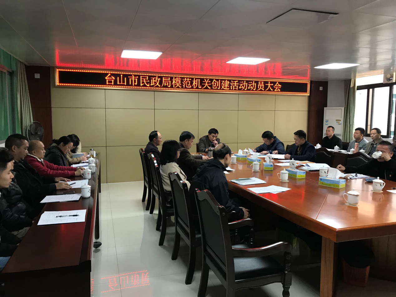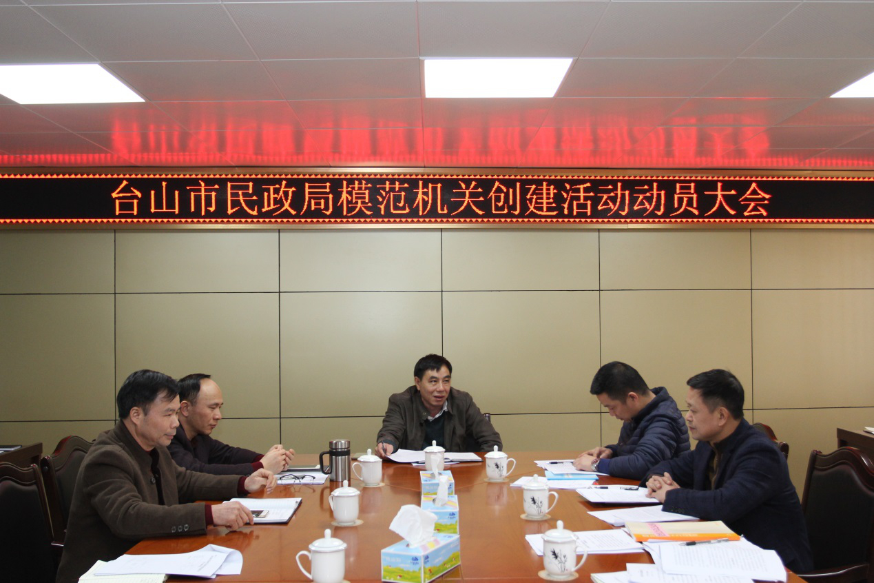 為深入學習貫徹習近平總書記關于加強黨的政治建設的重要論述和對推進中央和國家機關黨的政治建設重要指示精神,市民政局于1月16日在局六樓會議室召開模范機關創建活動動員大會,研究制定《臺山市民政局關于模范機關創建活動的實施方案》并部署落實工作。市民政局黨組成員、黨員領導干部、股室人員及屬下單位負責人參加了會議。 黨組書記、局長林杰榮在會上作動員講話。一是要強化政治擔當,提升思想覺悟。各黨員干部要切實提高認識,深刻領會和全面把握推進黨的政治建設的重大意義,深刻認識開展模范機關創建活動的重要性,重點把握開展模范機關創建活動的總體要求和分層的各目標任務。二是結合工作實際,制定具體實施方案,明確模范機關創建的總體要求、主要任務和措施步驟,切實有力地推進模范機關創建工作。三是深入調研,逐層查擺,建立問題清單。針對日常工作的薄弱環節,集思廣益,聆聽群眾意見,責成問題清單與負責人。四是把創建活動融入到黨建各項工作中,推動與民政工作有機結合起來。各黨支部、各股室及下屬單位負責人要認真履行責任,督促創建活動有效落實,扎實推動我局黨的建設工作不斷開創新局面。 全體黨員干部要切實履行職責,以昂揚的斗志,實抓實干的態度,分層級逐項完成任務,抓好做實模范機關創建活動的工作。