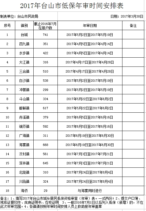附件:2017年臺山市低保年審時間安排表