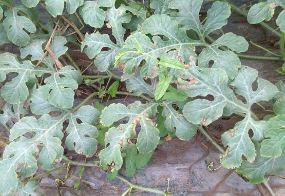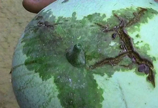 識別要點:①葉片,病斑大、半圓形或“V”形、有輪紋;②莖蔓,開裂、流膠