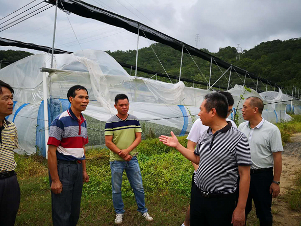 9月17日上午,江門市農業局鄭少強局長在市農業局伍健新副局長、種植股楊超股長和海宴鎮工作人員陪同下,到我市臺風登陸點海宴鎮檢查臺風災后農業受損情況。