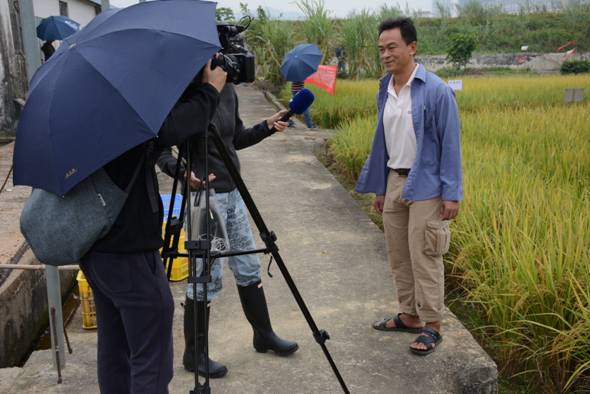 (市農科所水稻良種示范場場長謝文青接受市廣播電視臺記者采訪作相關講解)