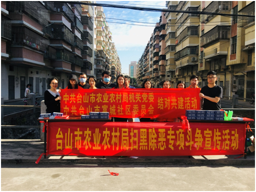 為進一步加強社區穩定,維護群眾生活安寧,助力臺山創建文明城市,11月13日上午,中共臺山市農業農村局機關黨委聯合中共臺山市富城社區委員會于明珠苑市場門口舉辦掃黑除惡專項斗爭宣傳活動。