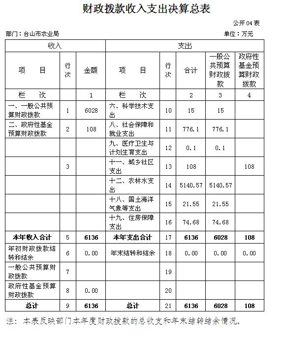 臺山市農業局2015年度財政撥款收入合計6136萬元。其中:一般公共預算財政撥款收入4813.25萬元,比年初預算數增加3714.07元,增長337.89%;主要原因是項目支出增加;政府性基金預算財政撥款收入108萬元,比年初預算數增加108萬元,增長100%;主要原因是項目支出增加。