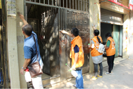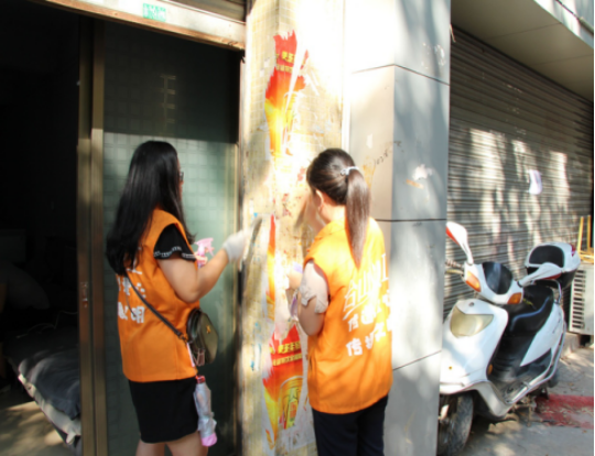 此次行動主要是針對社區(qū)內(nèi)小區(qū)的樓道、墻面、公共設(shè)施、電線桿上的小廣告進(jìn)行清理。當(dāng)天下午,黨員義工們帶著水壺、擦布、鏟刀、刷子等工具,分工合作,通過用手撕、用鏟子刮、用鋼絲球刷,使出各種方法清除貼在墻上、電線桿和居民樓道上的小廣告。這次清理行動,持續(xù)了將近兩個多小時,合共徹底清除沿街小廣告200多處。