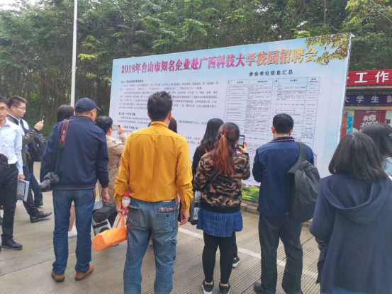 今年11月16日,由臺山市人力資源和社會保障局、臺山市就業服務管理中心主辦,江門市智通人才集團承辦的“臺山市知名企業赴廣西柳州科技大學招聘活動”在廣西柳州科技大學校園內成功舉辦,取得了滿意的成效。