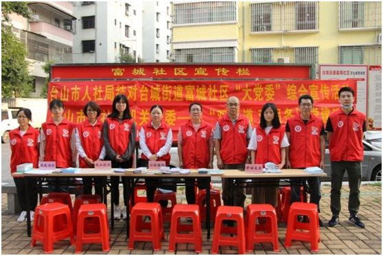 為推進基層黨建工作,推動黨員干部下沉社區一線,充分發揮機關、黨員的引領帶動作用。10月28日,市人社局結合“雙報到、雙服務”工作,牽頭組織市社保局和臺山市技工學校等下屬單位,聯合富城社區共同開展“大黨委”綜合宣傳活動。
