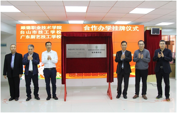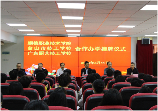 3月11日上午,臺山市技工學校(廣東廚藝技工學校)與順德職業技術學院合作辦學掛牌儀式隆重舉行。這是繼去年6月臺山市技工學校與廣東廚藝技工學校實現聯合辦學后,我市技工教育發展史上的又一盛事。臺山市人民政府副市長黃旭暉,順德職業技術學院黨委副書記、副院長劉毓,臺山市人力資源和社會保障局局長黃龍飛,順德職業技術學院烹飪學院、順德廚師學院院長陳健,順德職業技術學院繼續教育學院院長王法勇,臺山市技工學校校長陳華出席掛牌儀式。