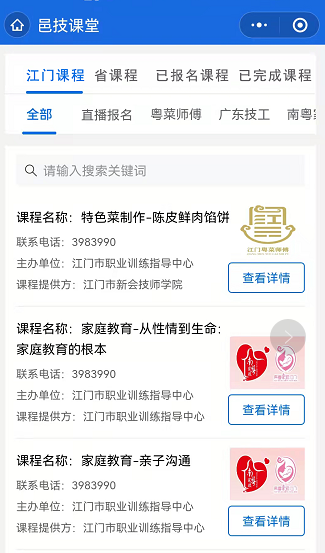 “邑技課堂”涵括省、市系列課程項目共2641個,讓您技能滿載而歸。其中江門課程111個,含粵菜師傅系列點心烘焙、特色菜制作類等40個,廣東技工系列先進制造業、電商類課程等30個,南粵家政家庭教育、中醫養生類等18個,工傷預防課程10個、公共實訓企業管理類課程13個;廣東遠程職業培訓平臺含粵菜師傅、廣東技工、南粵家政、數字技能、農村電商等二十四大類課程2530個。