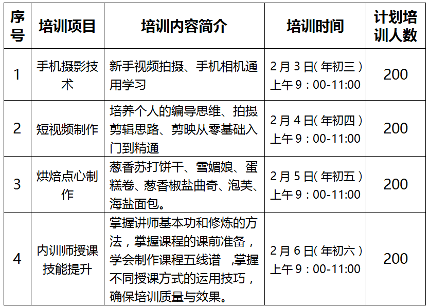 在春節期間〔2月3日-6日(年初三至初六,每天上午9:00時開課)〕開設四天的直播課程,邀請名師線上開課,涵蓋企業管理、烘焙面點和電商課程,配置專屬學習官在線指導學習,即學即實踐,通過線上培訓實現工作、學習、生活互不耽誤。