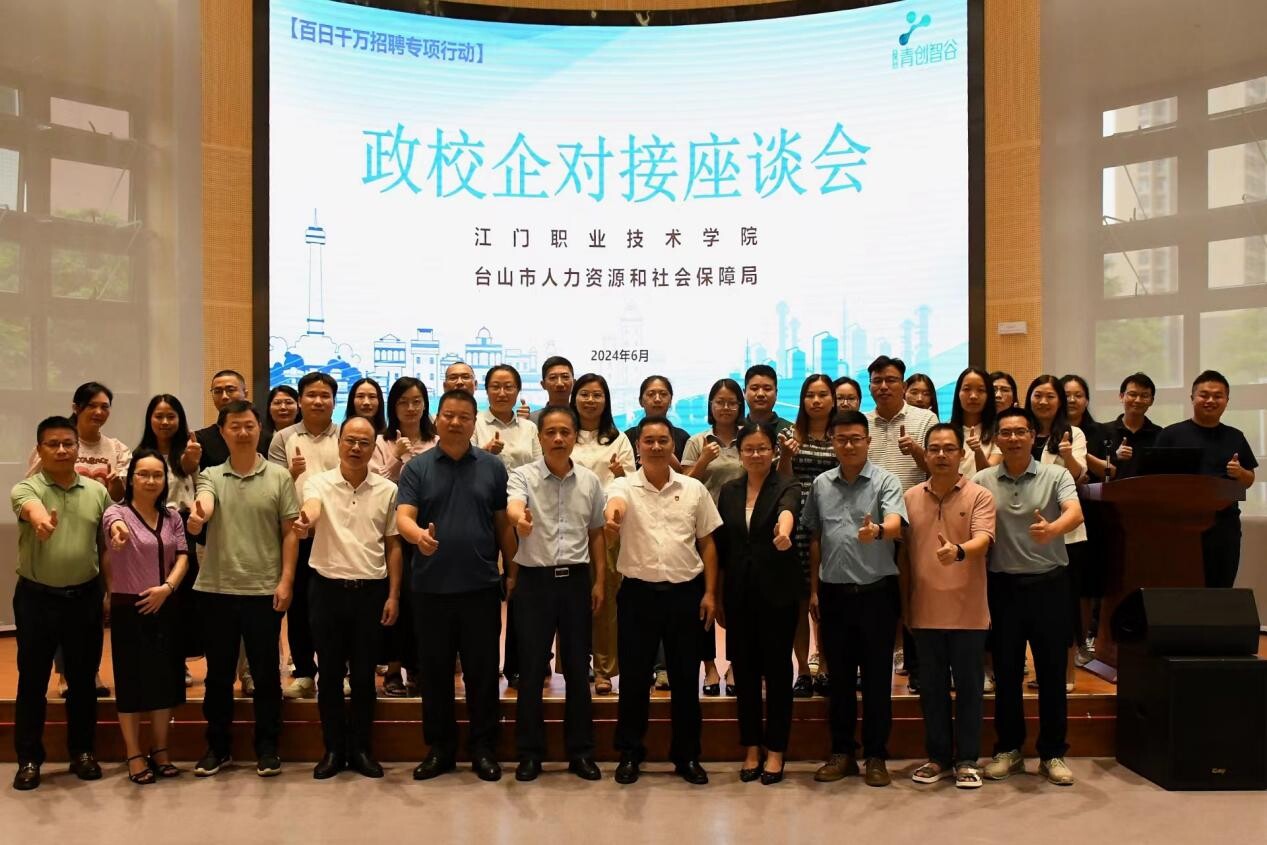 為進一步加強“政校園企”合作對接,落實高校畢業生就業創業十大行動方案,促進高校畢業生高質量就業,拓展校地合作交流渠道,吸引更多江門學子來臺早就業、好就業。6月14日,臺山市人社局聯合江門職業技術學院開展政校企對接活動,江門職業技術學院校長彭志平、副校長蔡勇、繼續教育學院、經濟管理學院、信息工程學院、材料與食品學院、智能制造與裝備學院、學生工作部、科研部職業技術教育研究所、實訓部等相關領導,臺山市人社局局長趙湖濱、副局長肖雄英、就業創業股、就業中心等相關負責同志參加活動。