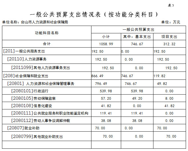 (一)本部門預算為匯總預算,包括:臺山市人力資源和社會保障局本級預算,以及納入編制范圍的下屬單位預算。下屬單位具體包括:臺山市就業服務管理中心、臺山市勞動監察大隊、臺山市勞動人事爭議仲裁院。