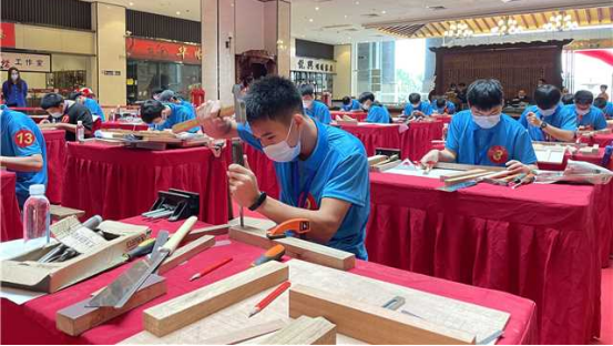 按照競賽要求,選手們要在六個小時內,完成一件木制窗花作品。比賽現場中,參賽選手熟練使用墨斗、劃線器、鋸、鑿、刨等工具,精準進行測量、切割等工序,經過開料、開榫、破料、拼料、打磨等流程,最終順利完成現制作品。