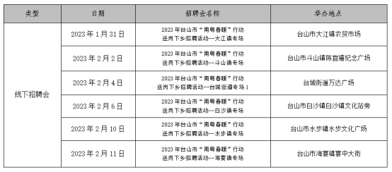 線下招聘由市人社局收集企業(yè)用工信息并制成展板進(jìn)行集中展示宣傳。從1月31日起,將在臺城萬達(dá)廣場、水步鎮(zhèn)、大江鎮(zhèn)、斗山鎮(zhèn)、白沙鎮(zhèn)、海宴鎮(zhèn)等地開展專場線下招聘會,助力廣大求職者在“家門口”“廠門口”就能找到工作。