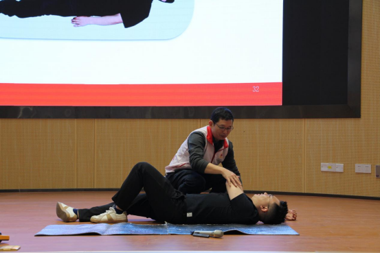 活動現場,紅十字會講師首先通過理論講解的方式為全體參訓人員闡述了急救的重要性以及急救的基本要素,著重詳細講解了現場心肺復蘇術理論課程、自動體外除顫器(AED)的使用及示范、氣道異物梗阻處理方法和流程。