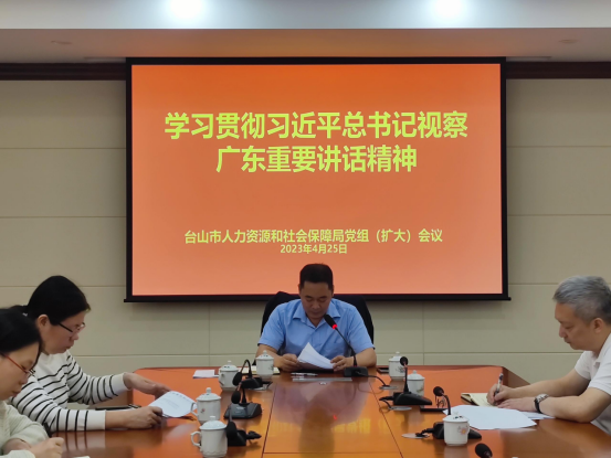 4月25日上午,市人社局黨組書記、局長趙湖濱主持召開黨組擴大會議,傳達學習貫徹習近平總書記視察廣東重要講話重要指示精神,以及上級有關會議、有關文件精神,動員人社系統上下堅定不移沿著習近平總書記指引的方向勇毅前行,對學習宣傳貫徹工作進行全面動員部署。局領導,機關各股室、下屬單位負責人參加會議。