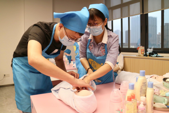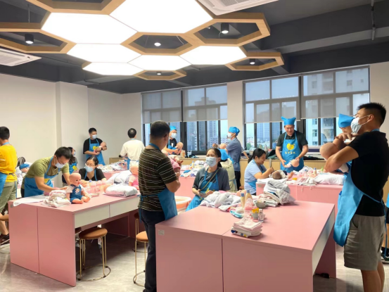 活動現場,家政老師向準爸媽們分享有關嬰兒日常照護注意事項及護理知識,并演示相關技能。講解結束后,各位奶爸在老師們的指導下進行實操訓練,平時粗手粗腳的大男人在抱著嬰兒模型學習操作的時候,變得小心翼翼、一絲不茍,從最初的手忙腳亂到得心應手,一舉一動都飽含愛意,學會了抱娃、喂奶、穿衣服、換尿布等一系列“高難度”動作,獲得了家政老師的贊揚和肯定。